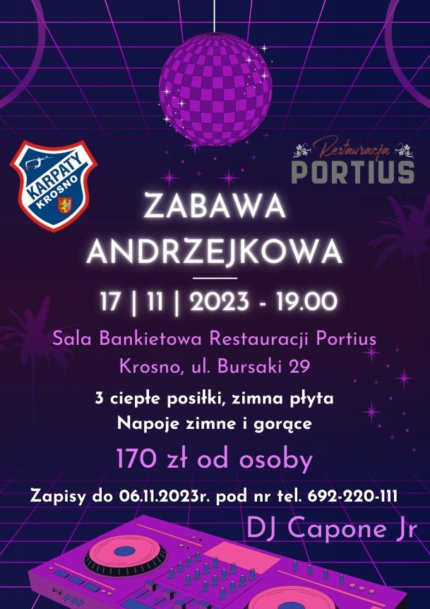 Zabawa odbędzie się 17 listopada br od godziny 19:00 w Sali Bankietowej Restauracji Portius (w hali sportowej - Krosno, ul. Bursaki 29).